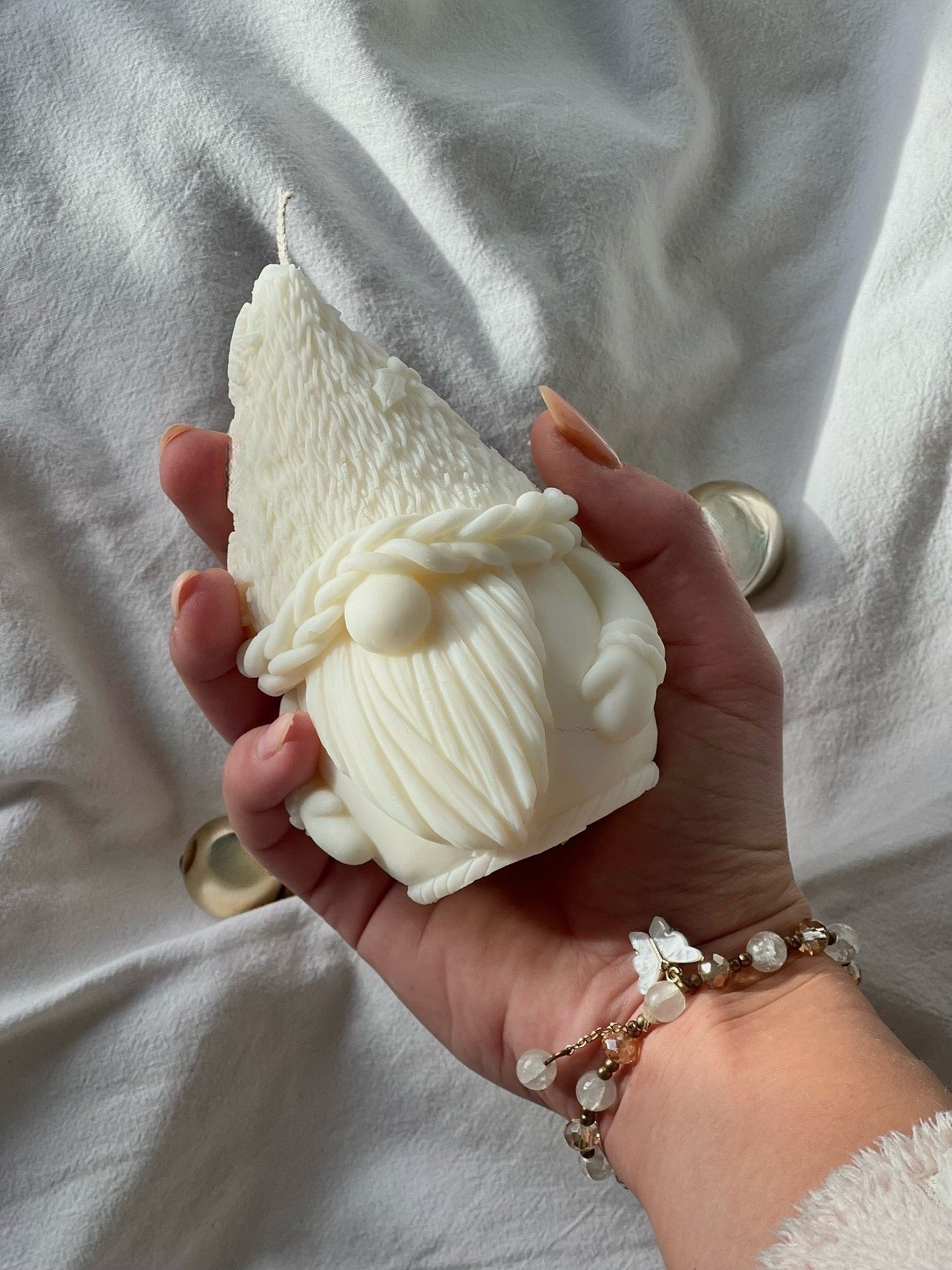 Breng warmte en gezelligheid in huis met onze handgemaakte gnoom-kaars! Deze gedetailleerde kaars heeft een schattig design met een puntmuts en gevlochten details, perfect voor de feestdagen of als sfeervol decorstuk.